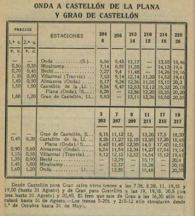 Es altamente significativo, el comentario de la Gaceta de los Caminos de Hierro, insertado el 16 de enero de 1915, con motivo de la autorización por el Ministerio de Fomento para enajenar en pública subasta el Tranvía a Vapor de Onda al Grao de Castellón de la Plana, puesto que los medios especializados, no se explicaban como la compañía contando con los tráficos de viajeros de una zona altamente poblada y con los de mercancías de la industria azulejera, minera y exportadora de cítricos, no los hubiera aprovechado para mantener un alto coeficiente de explotación “a menos que los errores ó abusos de su administración hayan convertido en imposible la marcha de la empresa”