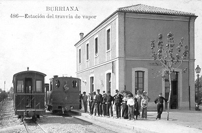 El tranvía en la estación de Burriana, postal comercial, fondo : Miguel Diago Arcusa