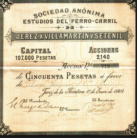 El año 1901 se creó la Sociedad Anónima de Estudios del Ferrocarril de Jerez á Villamartín y Setenil , con un capital de 107.000 pts distribuidas en 2,140 títulos de 50 pesetas, a la que concurrieron 774 inversores suscribiendo 2.125 acciones, siendo su primer presidente el Sr. Marqués de Bonanza (Papeles de Historia).