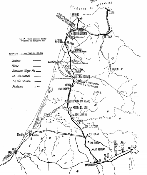 La línea de 295 Kms de los que 205 se situaban en la zona de protectorado francés y 90 en la zona española. Recordemos que los franceses detentaban el 60 % del capital y los españoles el 40% restante representado por la Compañía General Española de África. El proyecto del Ferrocarril de Tánger a Fez , se confió a una comisión de los gobiernos francés y español, integrada por :