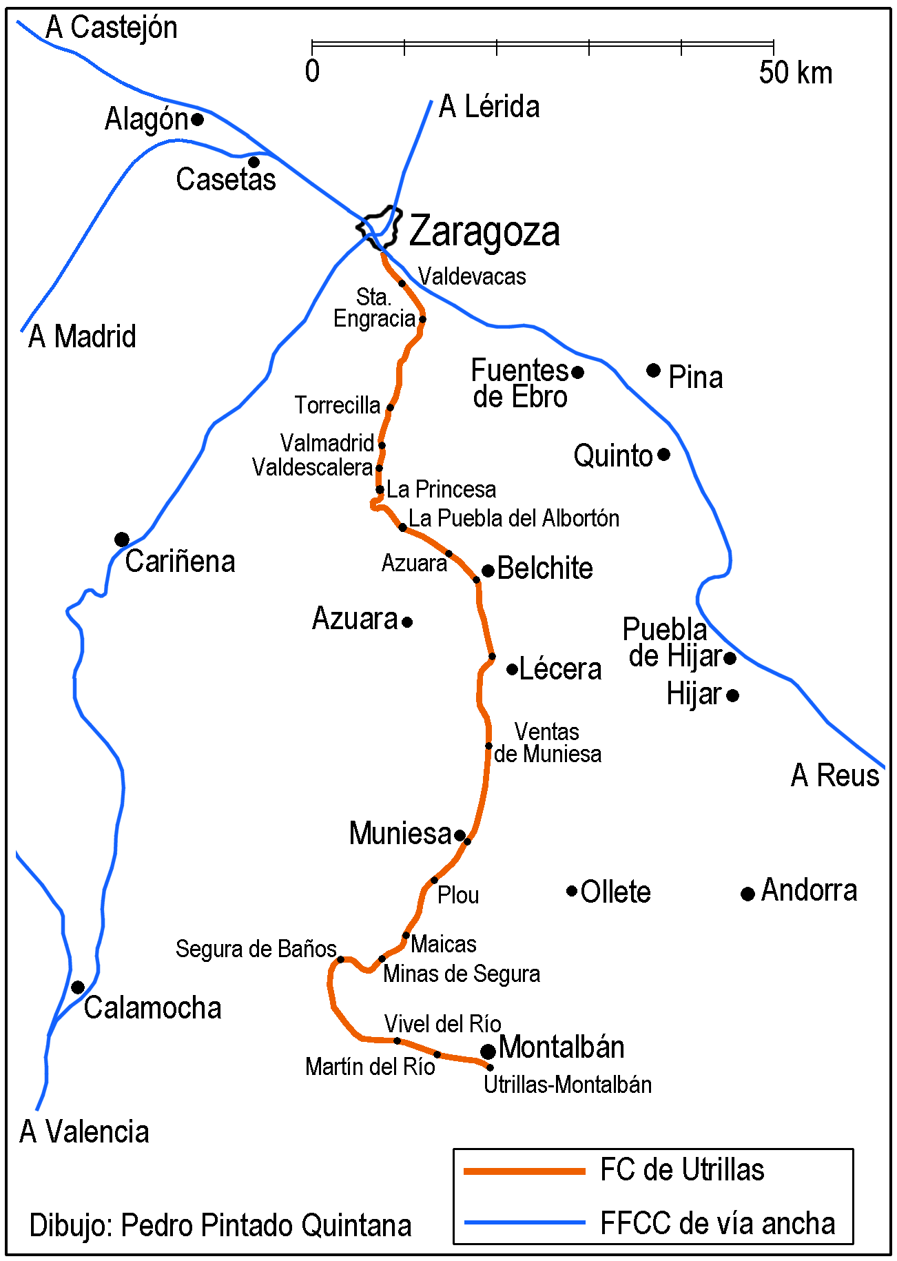 Dispuso de 127 Km de vía métrica, con once estaciones. Sin embargo el proyecto original contemplaba un trayecto de 135 Kms. Aquel proyecto se desarrolló a lo largo de 76 días de trabajos de campo. La concesión definitiva data del 19 de octubre de 1901, la inauguración oficial el 29 de septiembre de 1904, siendo inaugurada al tráfico el 30 de septiembre del mismo año, mediante un itinerario que partía de los lavaderos de Utrillas, estación de Utrillas-Montalban adoptando el trazado directo de Utrillas a Zaragoza por Belchite . Dispuso de un ramal de 1 Km enlazando su terminal en Zaragoza con la estación de MZA que le permitía transbordar carbones. Por otra parte para facilitar el acceso de los carbones de Utrillas a la red de MZA, se pretendió establecer, e incluso se llegó a solicitar a la Administración, un ramal desde Lécera a La Puebla de Hijar, de 22 kilómetros (R.M. Tomo 53, año 1902, pág 410), este ramal de Lecera se solicitó como línea secundaria con garantía de interés por el Estado, fijando la administración el acto de subasta para el 28 de febrero de 1908.